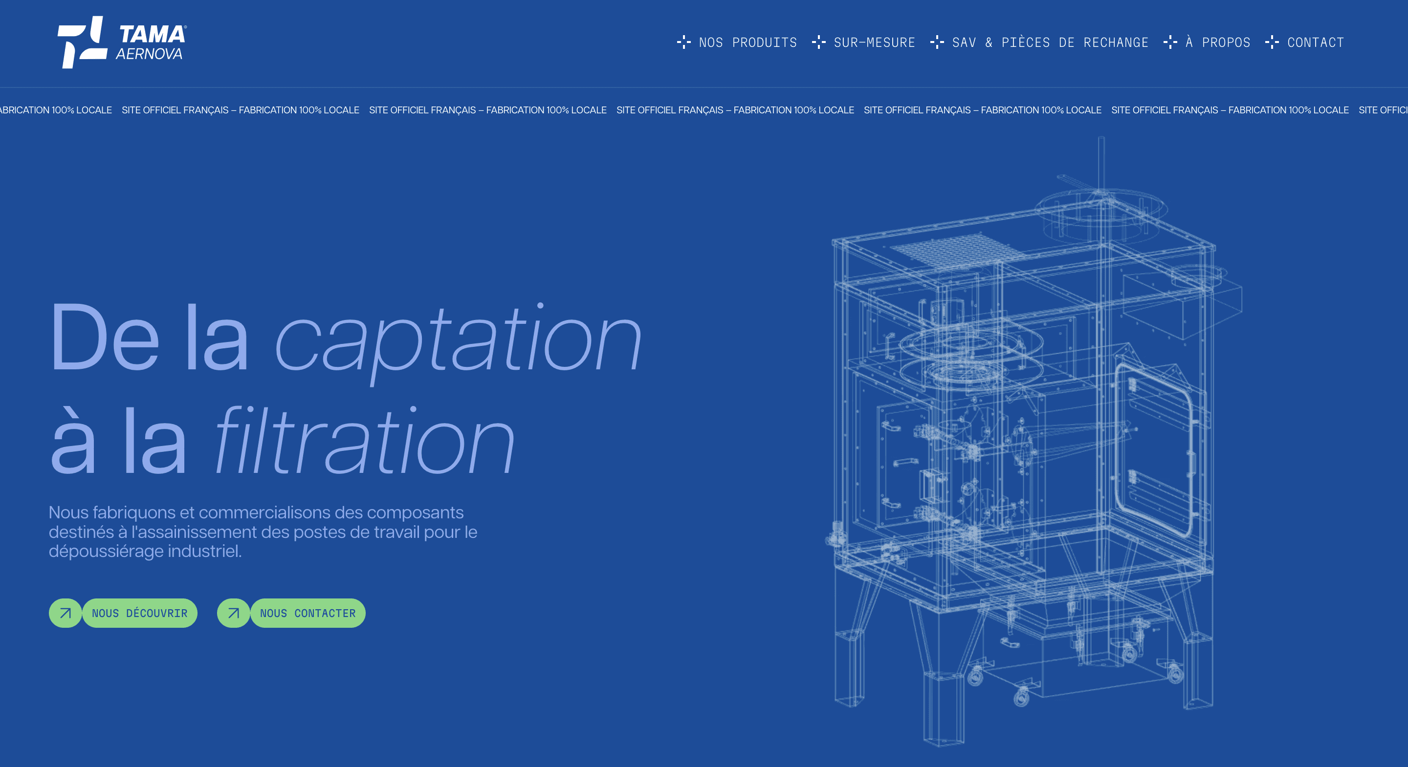 Développement d’un site vitrine pour accompagner le déploiement de la marque Tama Aernova sur le marché français. L’objectif : valoriser son expertise dans les solutions de filtration et de captation des poussières industrielles, à travers une interface claire, professionnelle et adaptée aux attentes du secteur B2B.